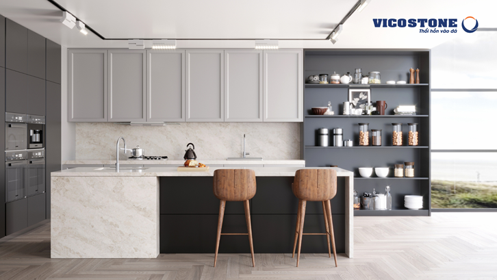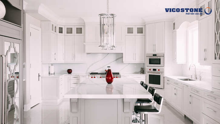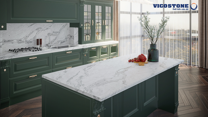 Sở hữu những đường vân nhẹ nhàng, uyển chuyển mô phỏng dòng sông băng trên nền tuyết trắng, Vicostone Statuario góp phần “thắp sáng” mọi ngõ ngách trong căn bếp.