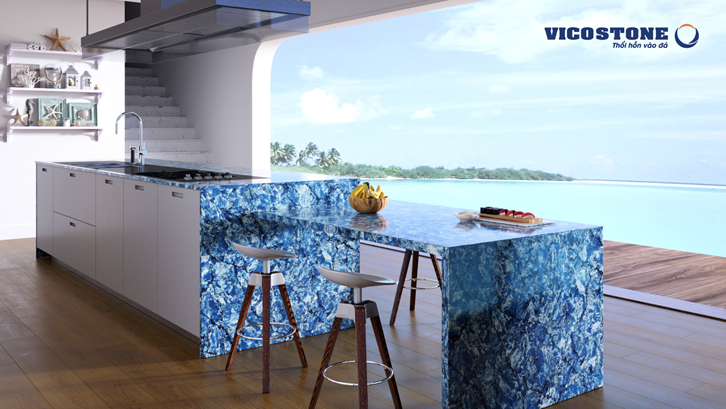 Lựa chọn vật liệu mang hơi hướm thiên nhiên, không cầu kỳ, màu sắc gợi nhớ đến biển với ánh sáng chan hòa,… là đặc trưng của phong cách ven biển (coastal style). Để tạo điểm nhấn trong tổng thể căn bếp, bạn có thể chọn đá Vicostone Thunder Blue vân rạn xuyên tấm.