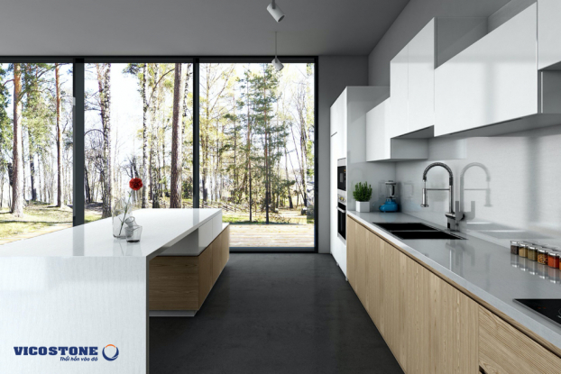 Khi được sử dụng để làm vật liệu bề mặt, màu trắng thường mang đến cảm giác sáng sủa, thoáng đãng. Tuy nhiên, gia chủ cần chú ý thường xuyên lau dọn, hoặc lựa chọn loại vật liệu dễ dàng vệ sinh, chống thấm vượt trội như đá nhân tạo gốc thạch anh Vicostone, để bề mặt luôn giữ được vẻ sáng đẹp.