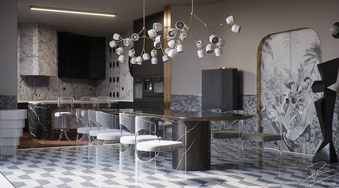 Cũng sử dụng mã đá Nero Marquina,thiết kế của KTS Thắng Quách lại mang đến vẻ đẹp sang trọng, cuốn hút.