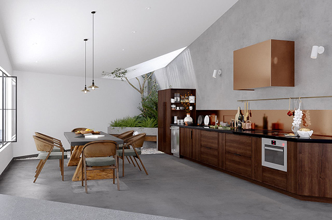 Căn bếp thiết kế theo phong cách Industrial (phong cách công nghiệp) của KTS Hương Trần mang nét mộc mạc, giản dị nhưng không kém phần hấp dẫn.