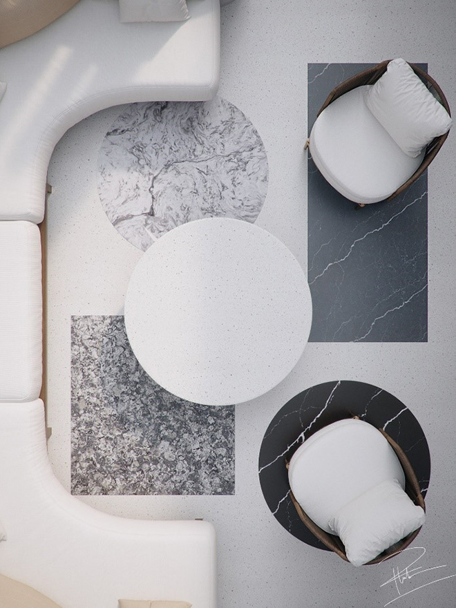 Với khả năng tạo vân xuyên tấm, đá Vicostone đã góp phần mang đến điểm nhấn thú vị trong thiết kế của KTS Mai Hạnh, làm nổi bật chủ đề ‘’Hơi thở của đại dương’’