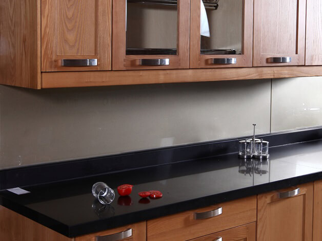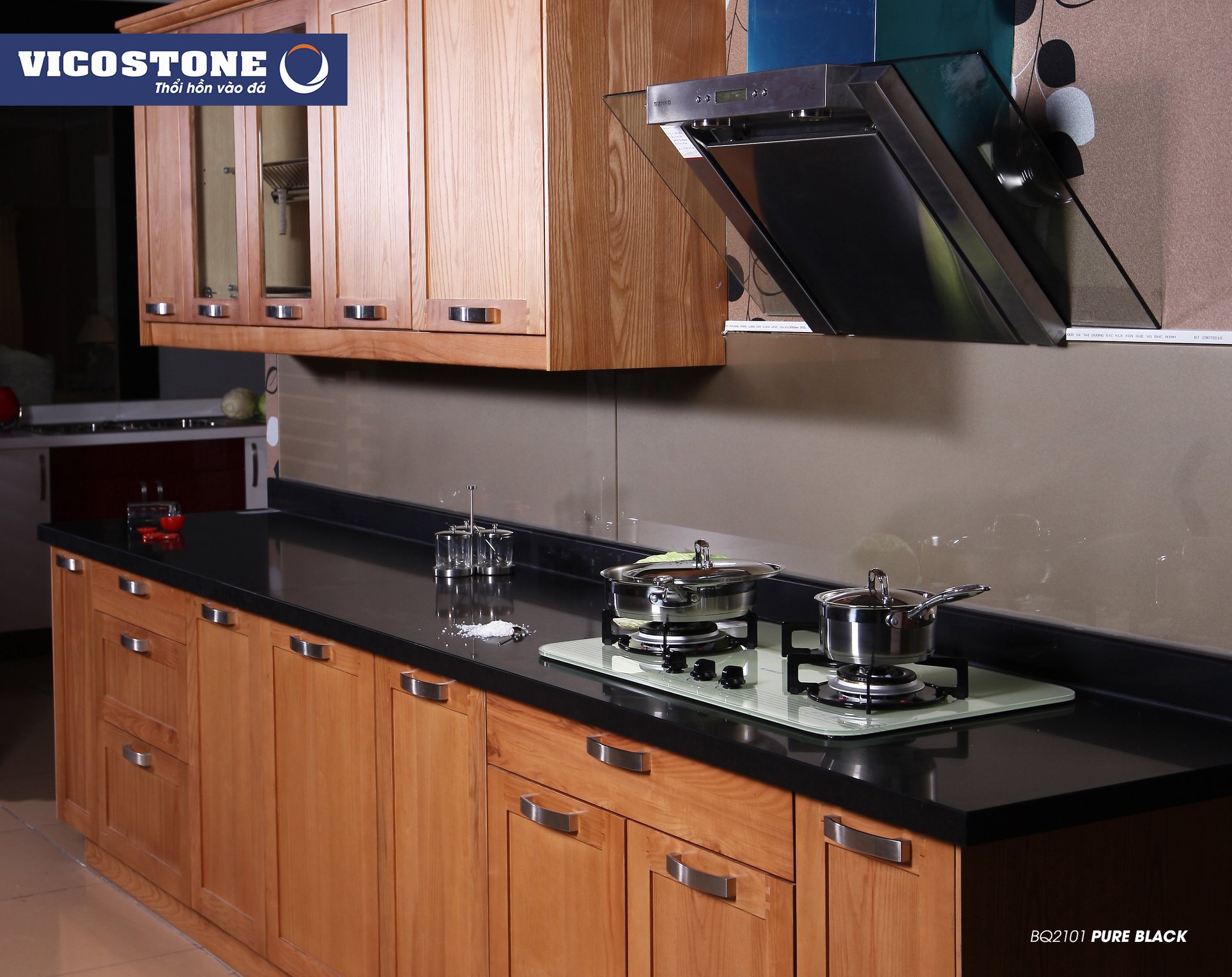 Sản phẩm đá Vicostone Pure Black với thiết kế màu đen toàn tấm, được công nhận là sản phẩm đá thạch anh nhân tạo đen nhất thế giới.