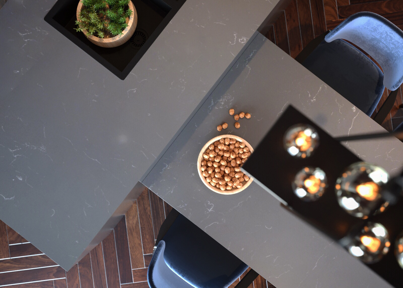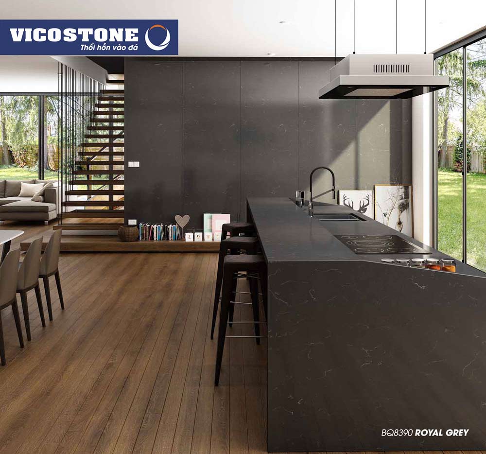 Sản phẩm đá Vicostone Royal Grey nằm trong nhóm các sản phẩm được phát triển dựa trên cảm hứng về dòng đá cẩm thạch với các đường vân nhỏ, mềm mại nửa ẩn nửa hiện trên bề mặt tấm đá. Royal Grey càng trở nên độc đáo hơn khi xuất hiện trong sự tương phản nhẹ nhàng giữa những đường vân trắng mỏng và bề mặt xám ấm.