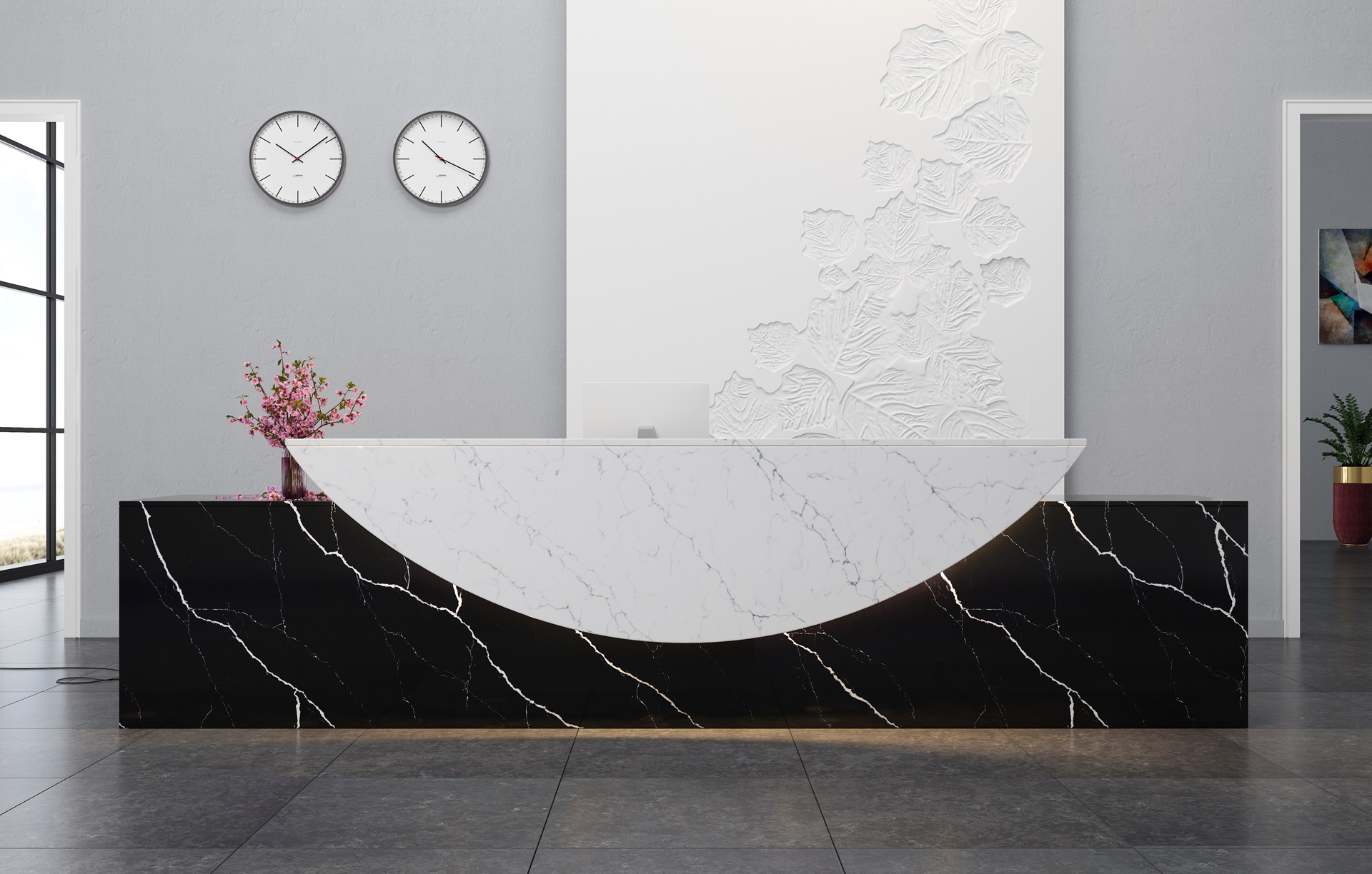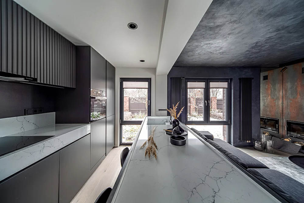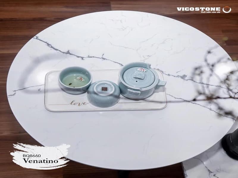 Sản phẩm đá Vicostone Venatino độc đáo với những đường vân màu xám dệt vào nhau, tạo thành những cành cây lớn, mô phỏng những càng phượng nhẹ nhàng thanh thoát.