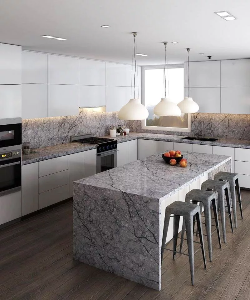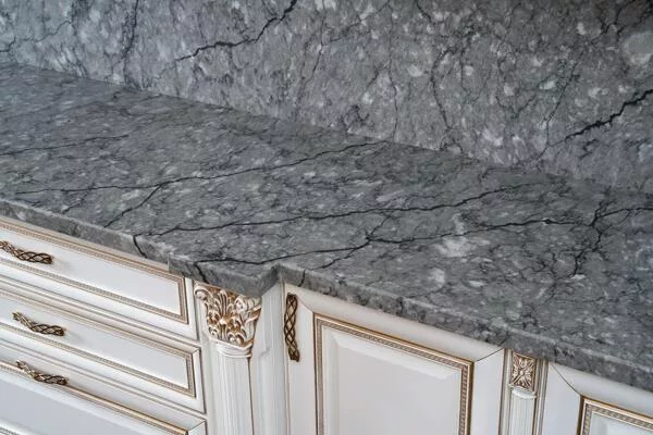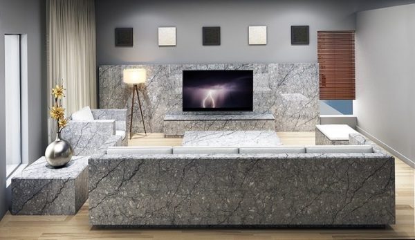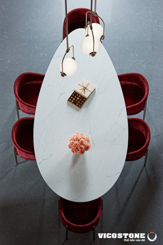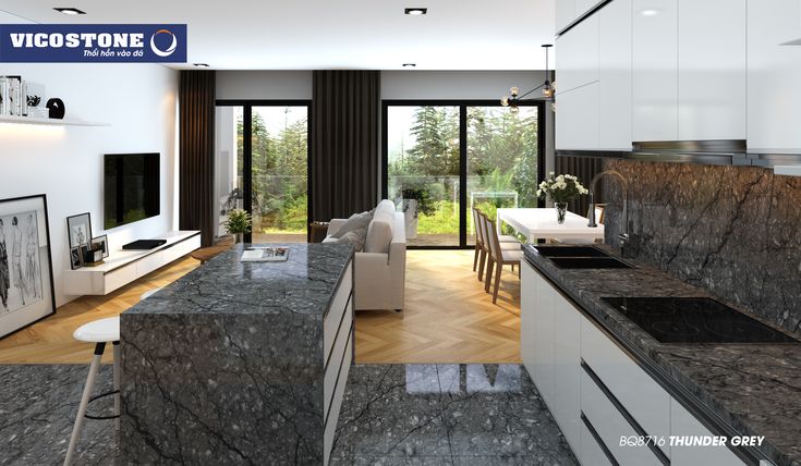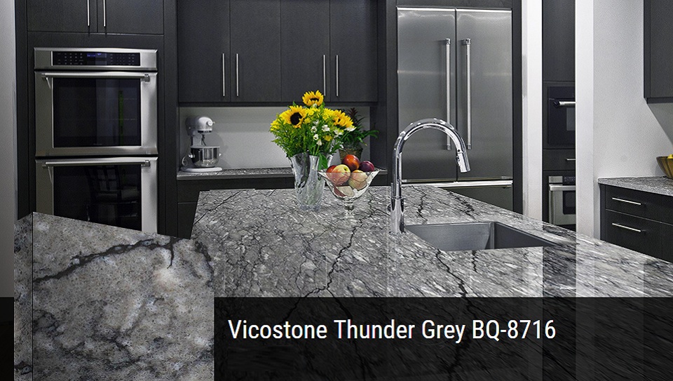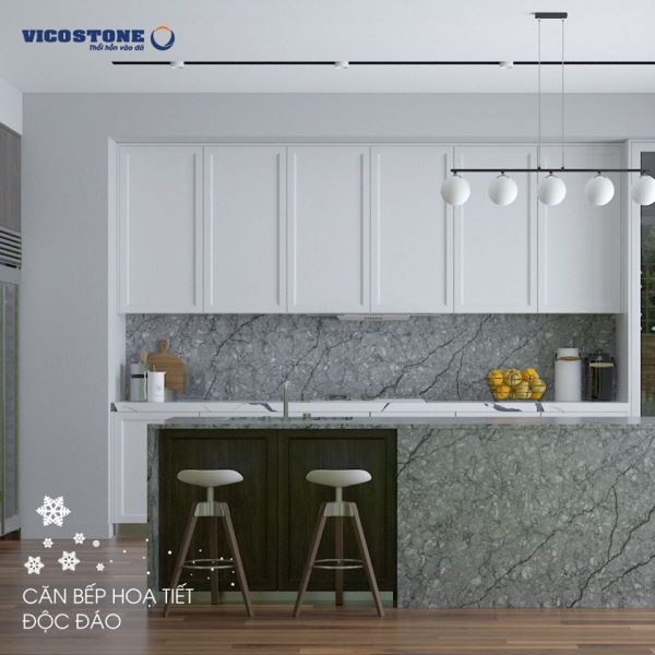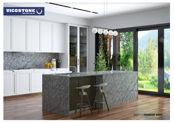 Sản phẩm đá Vicostone Thunder Grey nổi bật với những đường vân rạn, như những tia sét đánh mạnh mẽ trải dài toàn tấm. Các đường vân này càng trở nên nổi bật hơn trên bề mặt mô phỏng hiệu ứng tương tự granite (granite-looking) xám sáng phóng khoáng.