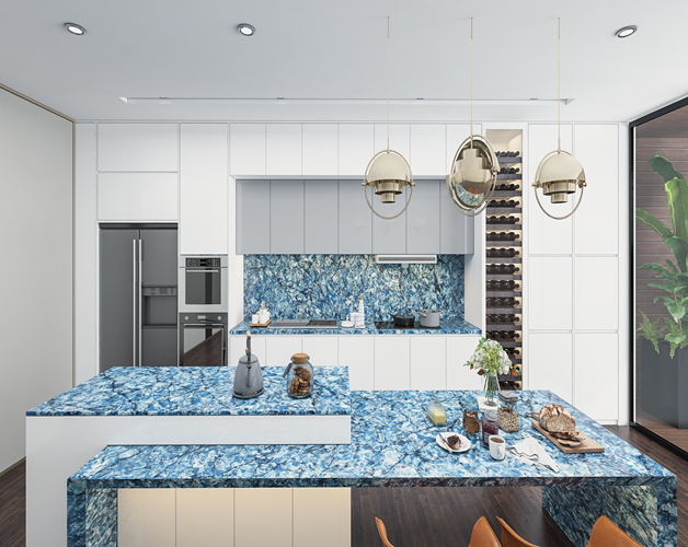 Sản phẩm đá Vicostone Thunder Blue nổi bật với những đường vân rạn, như những tia sét đánh mạnh mẽ trải dài toàn tấm. Các đường vân này càng trở nên nổi bật hơn trên bề mặt mô phỏng hiệu ứng tương tự granite (granite-looking) với màu xanh lam của đại dương.