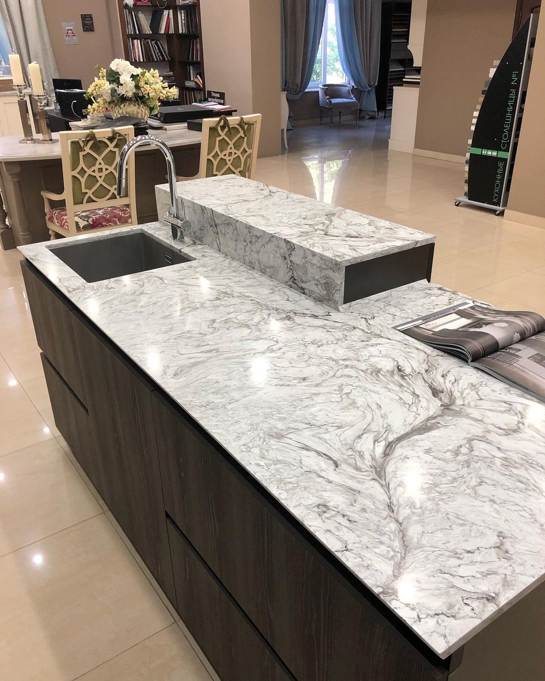 Sản phẩm đá Vicostone Avalanche độc đáo với những đường vân xám điểm xuyết màu nâu đậm vần vũ, hoà quyện vào nhau tạo thành những vòng xoáy như những con mắt bão cùng hiệu ứng chuyển tiếp nhẹ nhàng và tự nhiên giữa vân và nền đá.