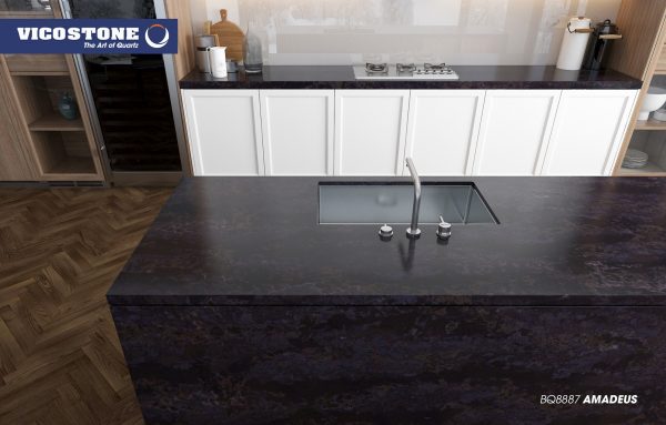 Sản phẩm đá Vicostone Amadeus là sự phối màu mượt mà giữa nền đen với các đường vân màu vàng ánh kim, tạo hiệu ứng 3D trong suốt độc đáo, mô phỏng bầu trời vùng vực của Trái đất về đêm, phù hợp với các thiết kế cá tính.